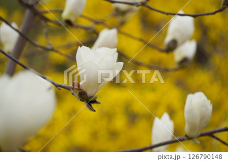 Close-up of White Magnolia Blossoms with Yellow Forsythia in the Background