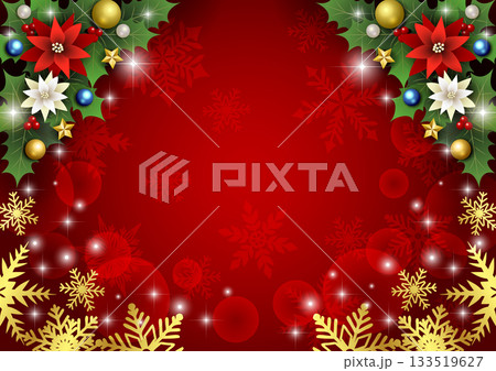聖誕背景,底部是閃閃發光的雪花,金色,一品紅,頂部是冬青,可愛,插圖,橫向