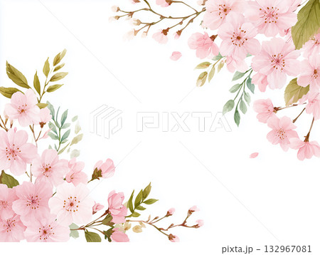 左下角是櫻花盛開、花瓣飛舞的春日背景。柔和的春日設計,櫻花花瓣斜向飛舞。