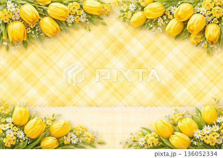 黃色鬱金香和格子圖案橫向背景素材 | 明亮的春季壁紙