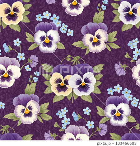 Charming classic floral seamless pattern with Victorian pansy flower design on rich dark purple background
