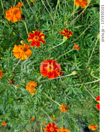 在秋日花園裡,紅色的萬壽菊競相綻放。