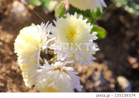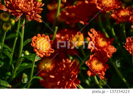 Close-up of chrysanthemums under the sunlight in the garden. Orange flowers in rural. Flower and plant.