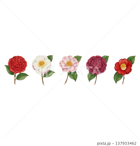 山茶花水彩插畫套裝,日式花卉素材,紅色、白色、粉紅色
