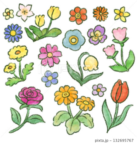 Flowers: Bright illustrations and flowers form a decorative border, isolated on a white background.