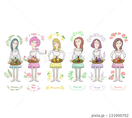 尤加利、薰衣草、迷迭香、茶樹、天竺葵和薄荷精油插圖
