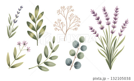 Delicate botanical illustration of lavender flowers and violet blooms with green leaves
