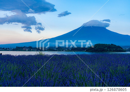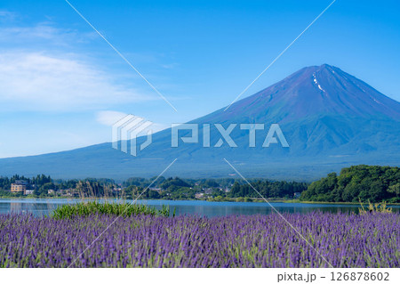 【夏日素材】清晨從河口湖眺望富士山和薰衣草【山梨縣】