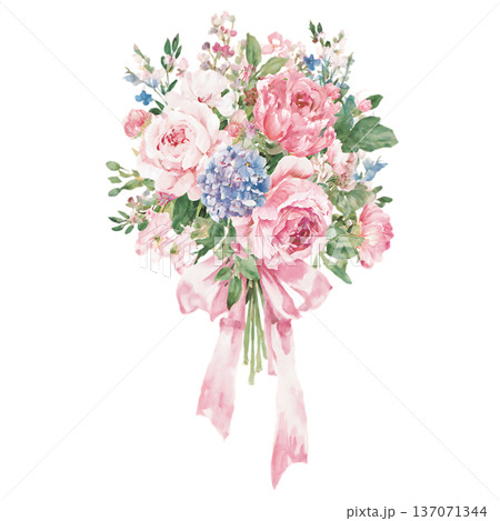 水彩風格手繪花束插畫 | 粉紅緞帶與柔和的花朵
