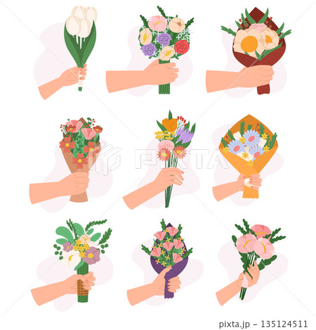 Set of Hands Holding Flower Bouquets Isolated On White Background. Gift Delivery For Holiday, Man Giving Blossoms