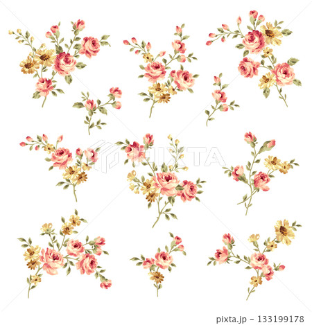 一組水彩手繪花束和花朵部件