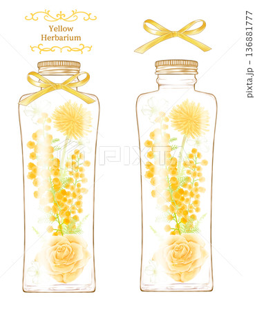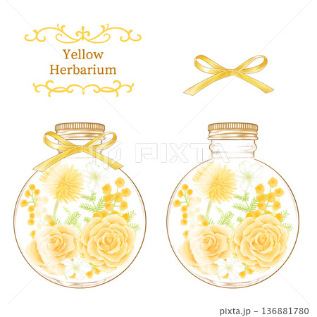 圓形瓶子裡的黃色花草植物標本