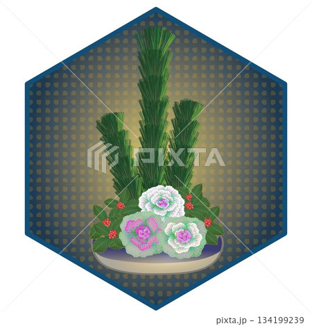 新年花卉插圖,六角形背景