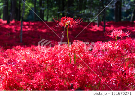 一幅鮮紅色的孤挺花的圖片充滿了樹木。 「岡山縣真庭市川東公園」