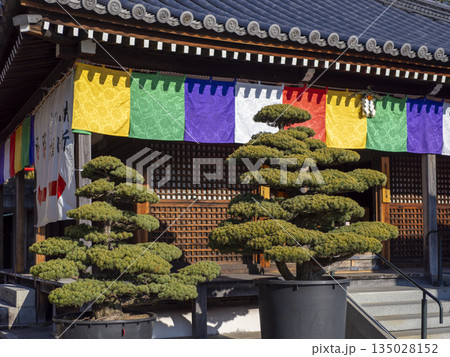 Bansai. Garden with pine tree niwaki. Tree with dense needles and branches.