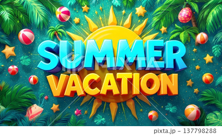 vibrant summer vacation design with sun, beach balls, and tropical foliage.