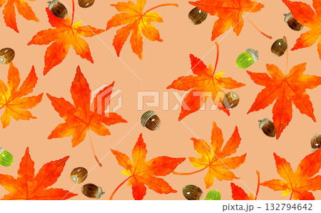 秋天楓葉和橡子的無縫圖案。手繪水彩插畫背景,描繪了秋季植物。