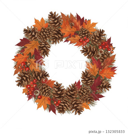 Autumnal Wreath with Maple Leaves Pine Cones and Berries