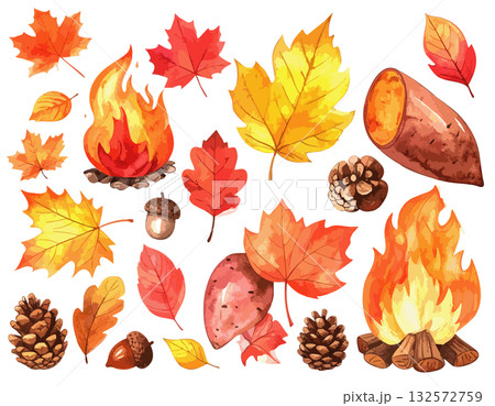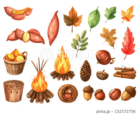 秋季色彩繽紛的楓樹、馬鈴薯和橡子插圖集