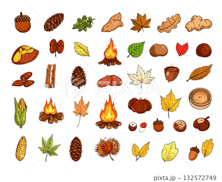 秋天圖像插圖(松果、橡實、秋葉、柿子)
