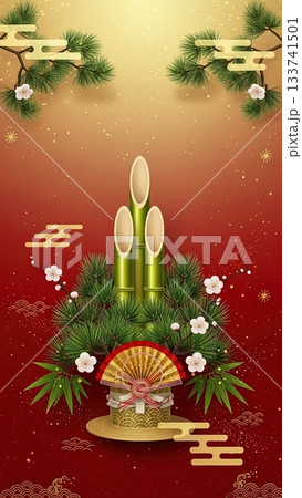 3DCG 垂直風景畫,可愛的門松裝飾排列在金色屏風前