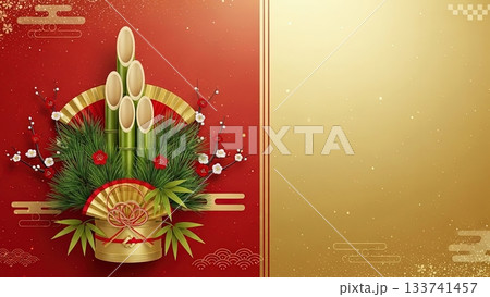 金紅色的日式紙紋理新年背景,飾以門松、松樹、竹子和梅花圖案。