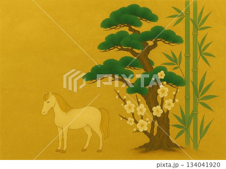 美麗的日本插畫,描繪了松樹、竹子、梅花以及紅白相間的梅花。