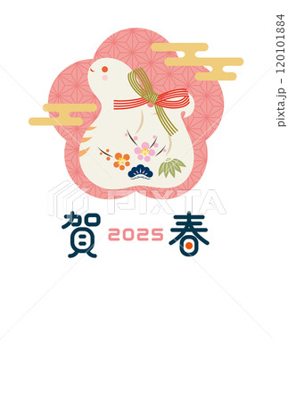 日式圖案背景,飾以鬆樹、竹子和梅花圖案,呈六邊形(新年/吉祥物),顏色為紅色、綠色和黃綠色。