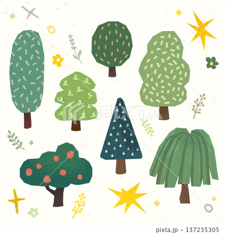Set of textured hand drawn paper cut style tree illustrations for nature design
