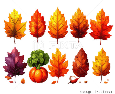 可愛的秋季植物插畫素材:秋葉、楓樹、銀杏、橡子