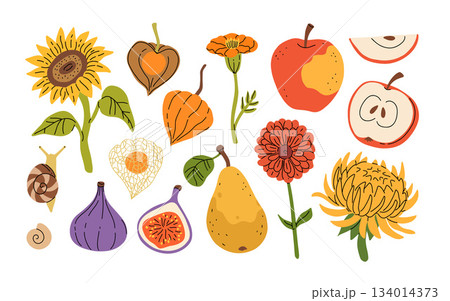 Autumn hand drawn vector background with leaves, fruits, flowers, seeds, snails. Autumn gifts decorative tag, sticker, card. Fall designed frame.