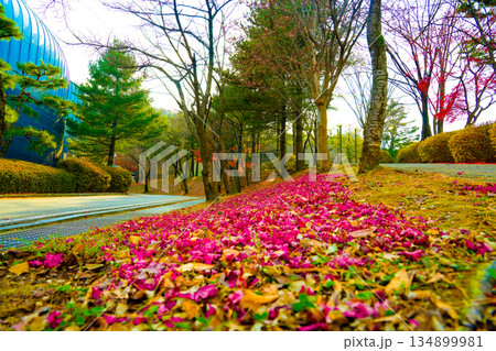 Red marple leaves fallen to the ground in Autumn season at South Korea