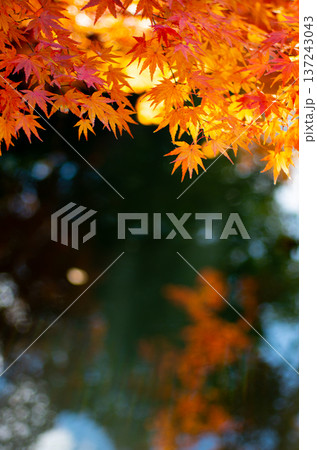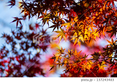 在長野縣上名郡箕輪町東箕輪,著名的賞楓勝地-紅葉湖(箕輪水壩)活動廣場附近,背光照射下的楓樹熠熠生輝。