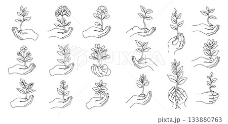 Line Art Hands Holding Plants, Flowers, and Seedlings Growth and Nurturing