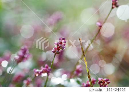 一張微距照片,展現了纖細的蓼花在晨露的映襯下閃閃發光,背景是柔和的散景效果(兵庫縣豐岡市)。