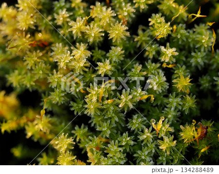 苔蘚在晨露的襯托下閃閃發光的微距照片(兵庫縣豐岡市)