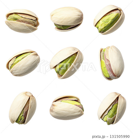 Nine pistachios are arranged grid pattern against transparency background, showcasing their green kernels partially visible through open shells. composition highlights natural texture and color