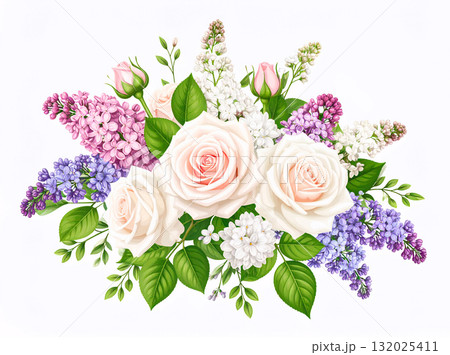 一片美麗的花田,淡紫色的丁香花和白色的玫瑰,像一幅水彩畫,周圍環繞著柔和的光線。