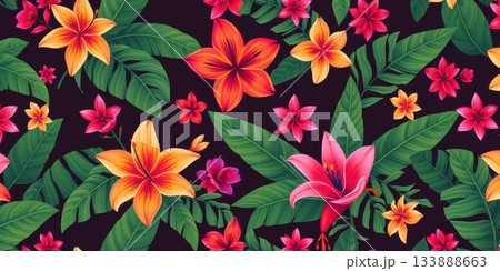 Vibrant tropical floral pattern with exotic blooms and lush foliage creating a beautiful background