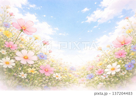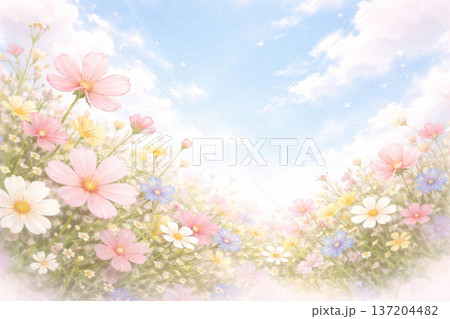 盛開的波斯菊和藍天(特殊攝影造成的柔和色調)