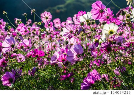 粉紅色的波斯菊在秋日的陽光下閃耀