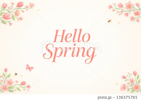 春季極簡卡片「你好,春天」粉彩花卉邊框向量圖