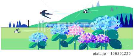一幅初夏風景插畫,描繪了一列藍色火車沿著鐵軌行駛,周圍是盛開的繡球花和飛翔的燕子。