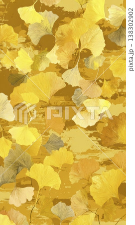 抽象的日式圖案,以金色為底,飾以層疊的銀杏葉,背景材質為染色織物風格。