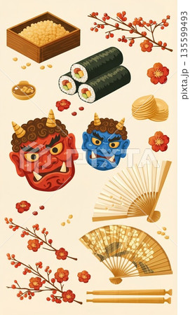 節分插圖(節分背景,有紅鬼、藍鬼、冬青沙丁魚、豆子和江戶卷)