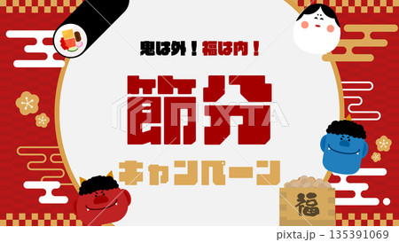 2026年節分插圖及背景框,以鬼怪、惠方捲和豆子為主題,附有標誌文字