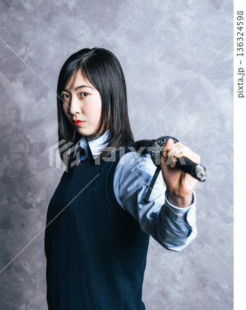 穿著制服的高中女生的手拿著劍