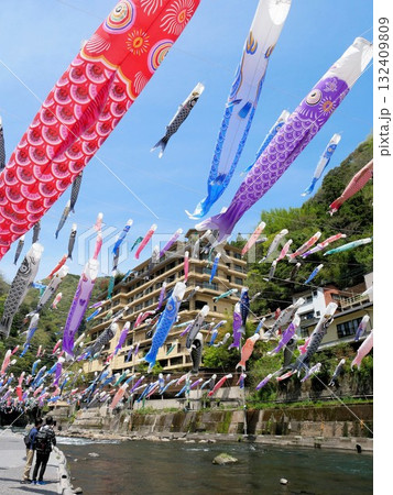 杖立溫泉美麗的鯉魚旗、杖立溫泉的河床(熊本縣小國町)