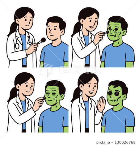 Doctor green skin mirror face cartoon transformation zombie illustration comic emotion