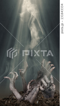 Zombie hands with wounds and blood reaching out of the grave ground with a dark background. Zombie, devil, evil, satan, or monster hand. Dramatic smoke or fog effect. Concept of Spooky Halloween